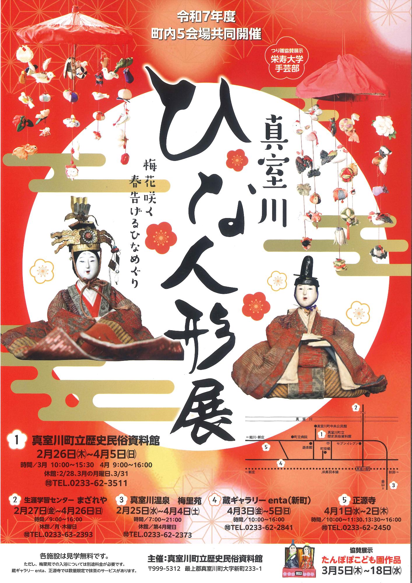 当資料館のほか、町内5施設でも同時開催します。施設ごとに特徴あるお雛様を展ご覧いただけます。ぜひ、足をお運びください。