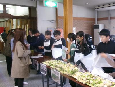 5年生が、甚五ヱ門芋の販売を行いました。【11月7日(木曜日)】 更新日:2024年11月18日 公開日:2024年11月18日 自分達で育てた甚五ヱ門芋を、梅里苑で販売しました。販売の日まで、チラシを準備したり、商品の配置等を考えたりして、当日を迎えました。地域の方や保護者の方から、購入していただき完売しました。