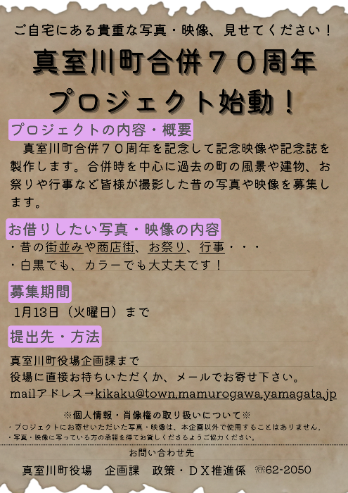 町村合併70周年を記念して、記念誌、記念映像、及び特別ウェブサイトを制作します。70年前を中心に昔の写真や映像、ビデオテープを貸していただけないでしょうか。
