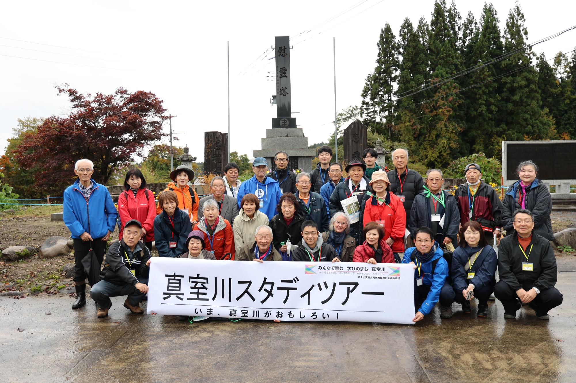真室川公園内の慰霊塔・忠魂碑前で集合写真を撮影しました。