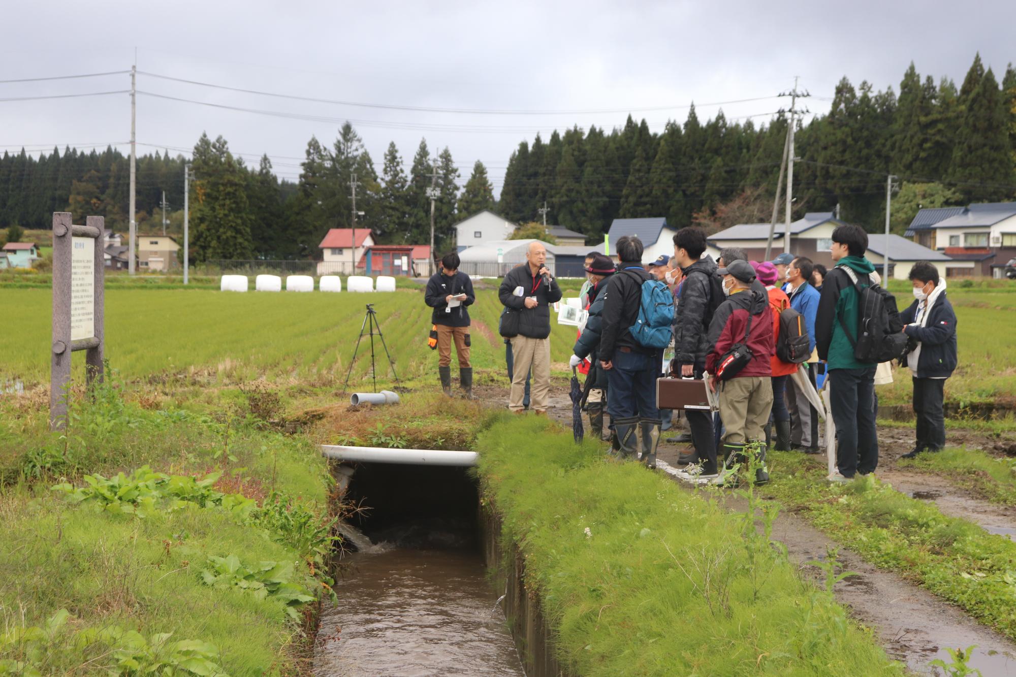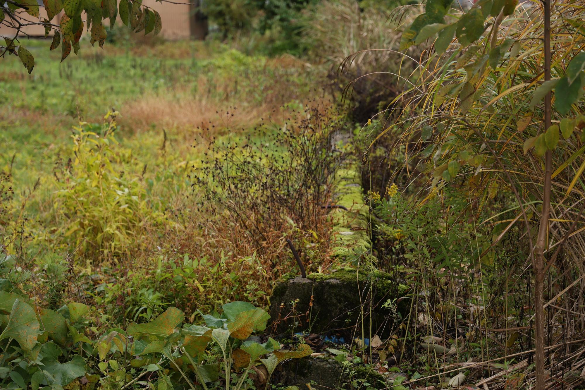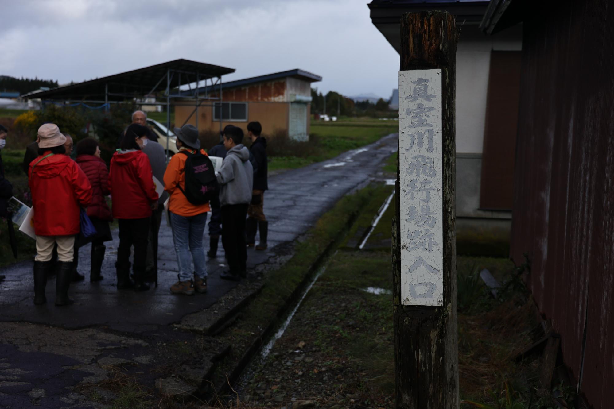 続いて、町内野々村地区にある真室川飛行場跡に移動し、真室川飛行場の概要を梁瀬平吉さんに解説していただきながら、現在も地区内に残る戦闘機の格納庫の基礎部分を見学しました。