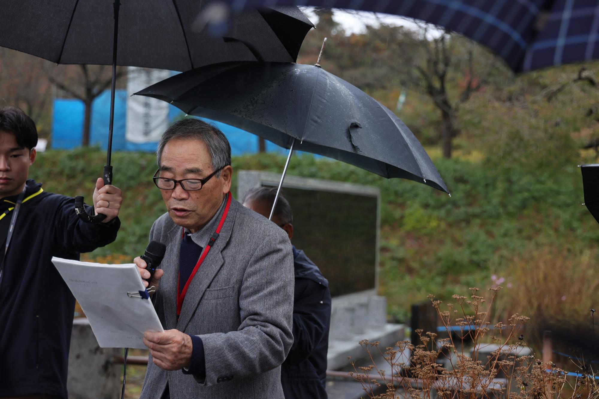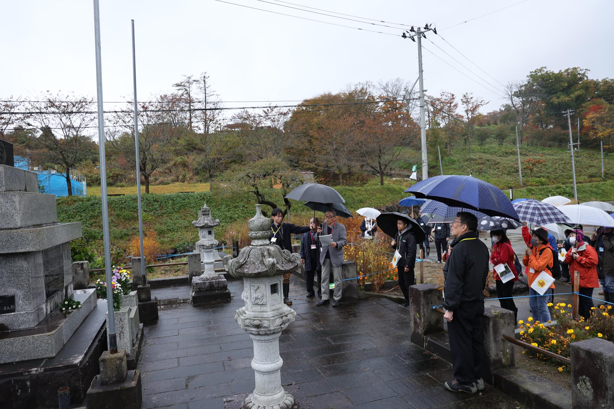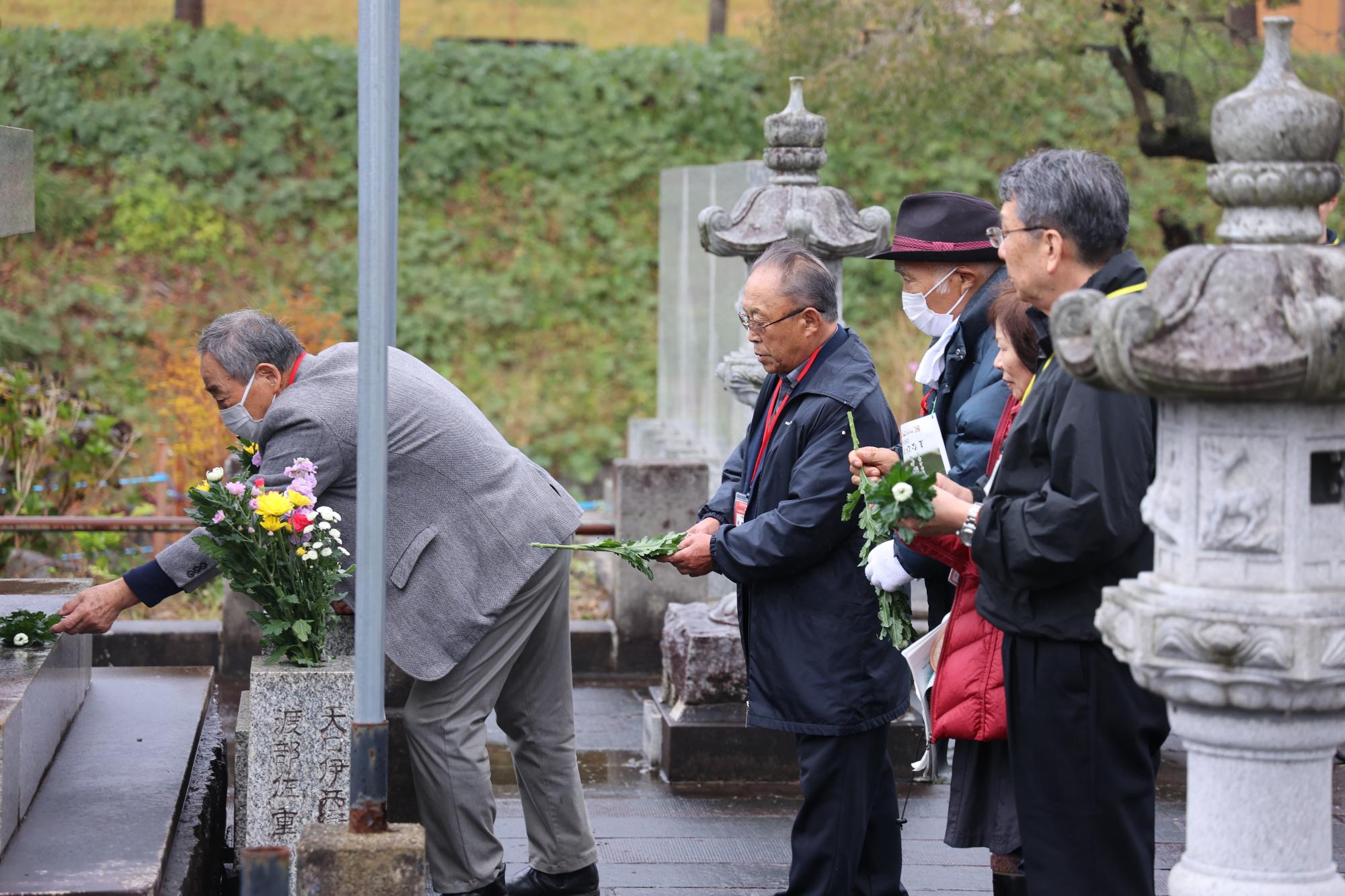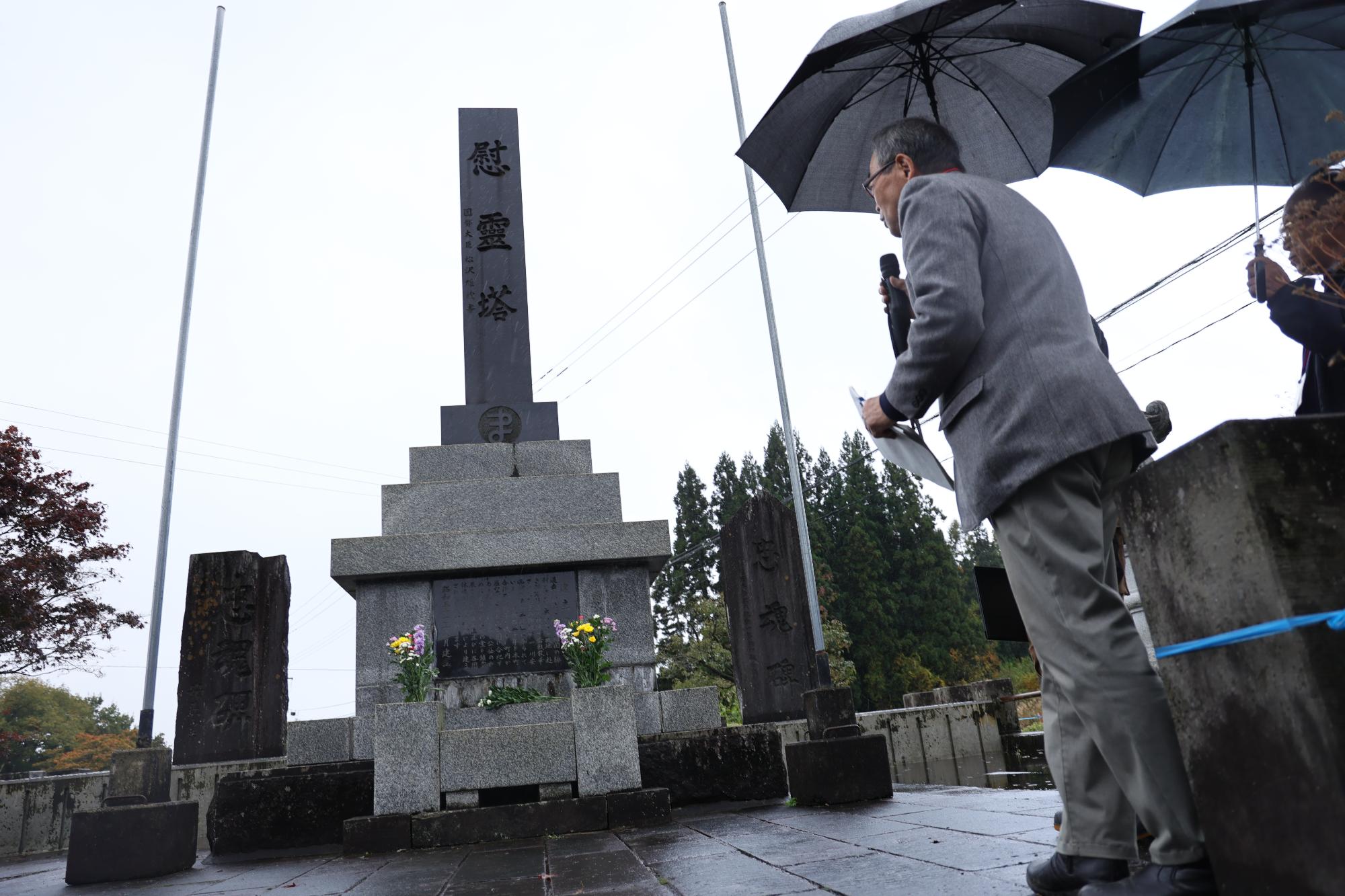 最後の見学地である真室川公園内の「慰霊塔・忠魂碑」では追悼の意を込めて黙祷と献花を行いました。