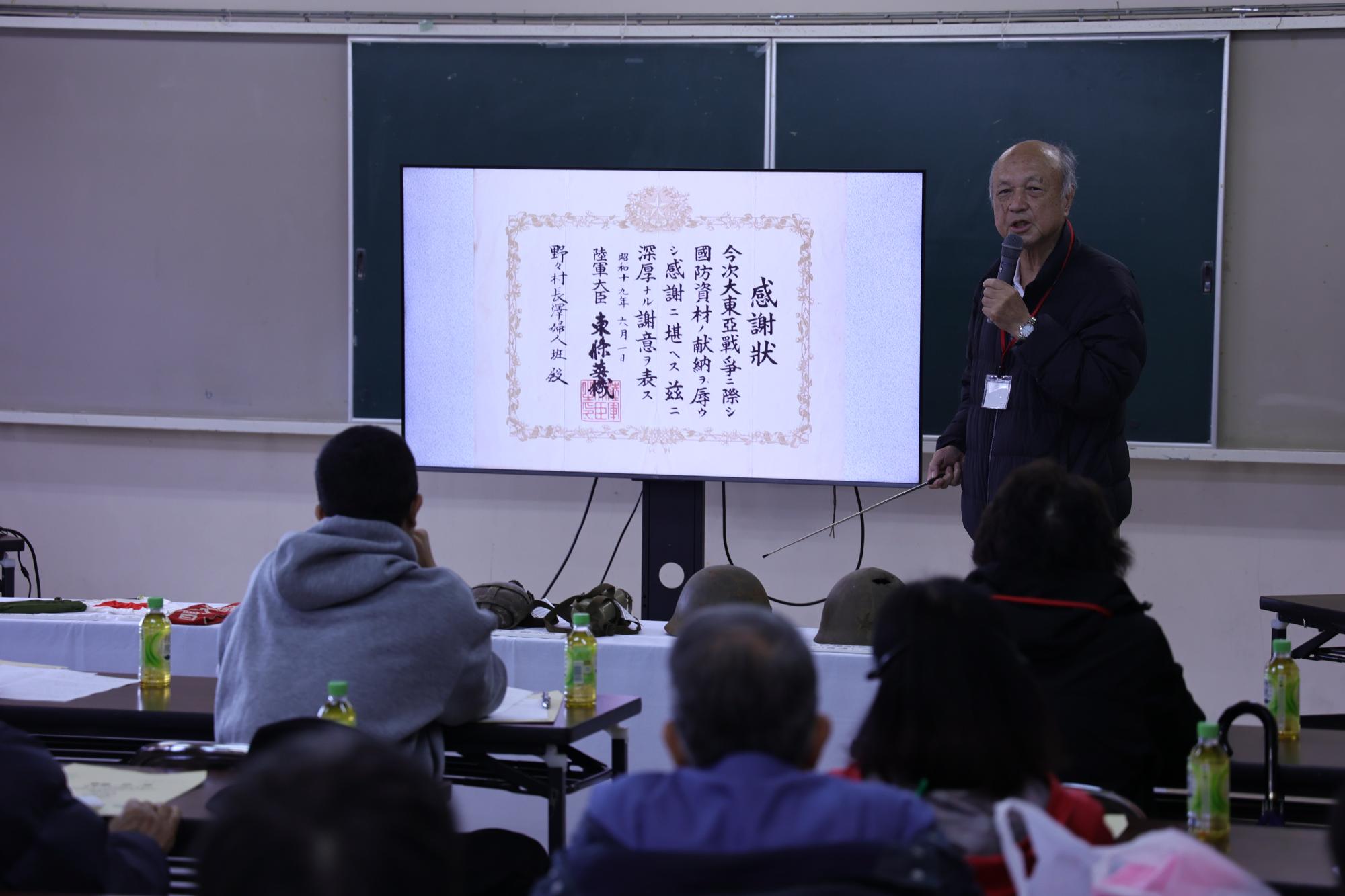 続いて、真室川町歴史研究会の梁瀬平吉さんによる解説で、真室川町歴史民俗資料館で所蔵している大戦当時に使われていた道具や当時の様子がわかる写真資料などから、第二次世界大戦中の人々の暮らしについて学びました。