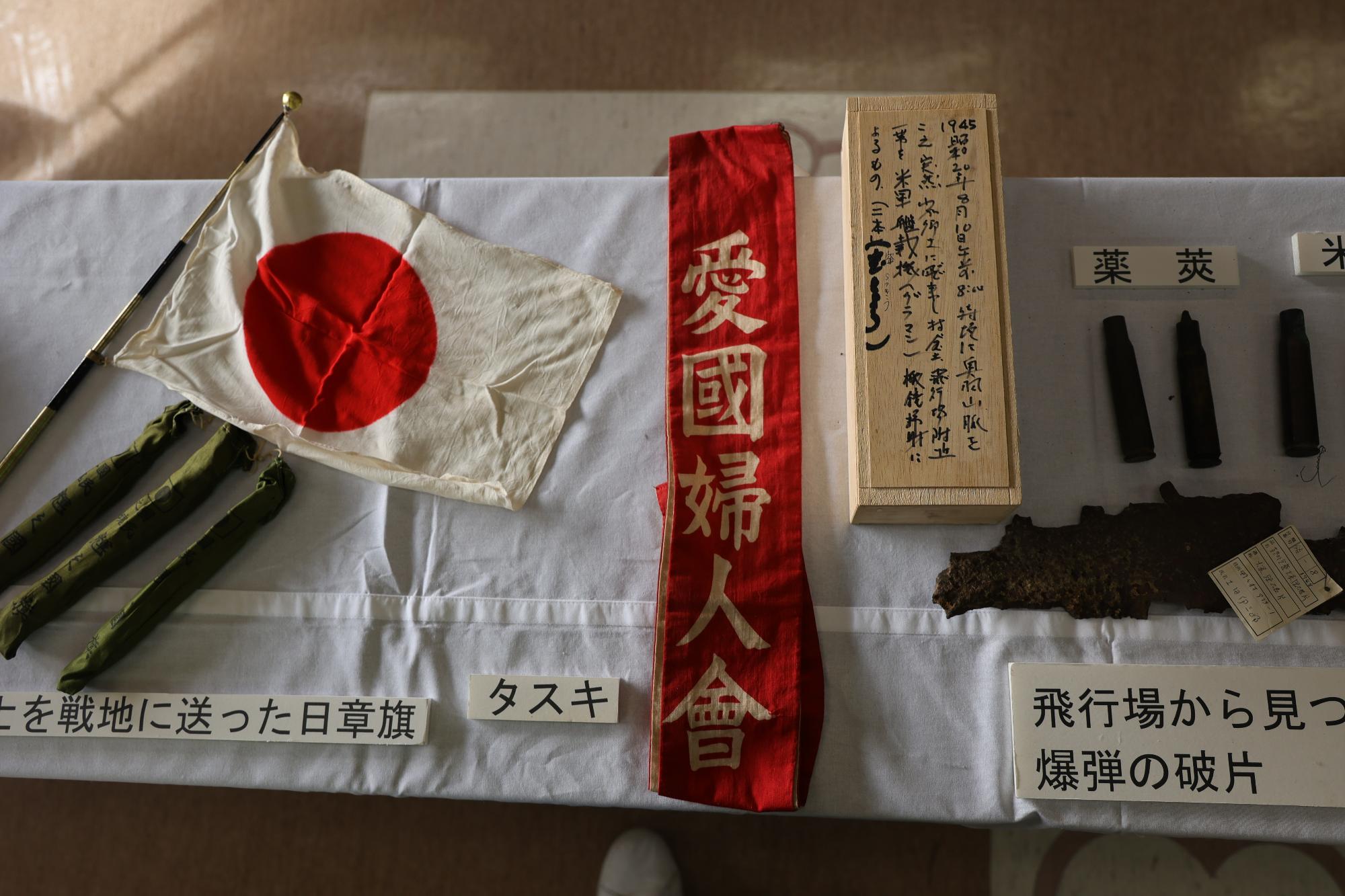 大戦当時に使われていた日章旗や愛國婦人會のタスキ。