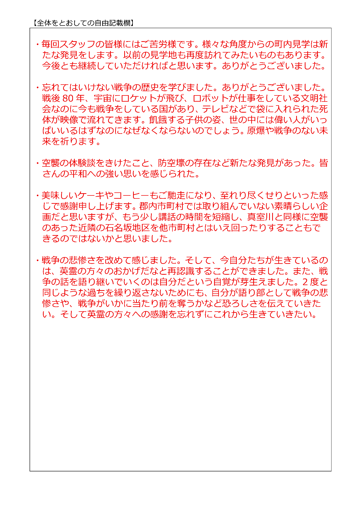 戦争体験者が減少している現代だからこそ、改めて戦争について学ぶことで「戦争の悲惨さ」「平和の尊さ」を改めて認識することができ、"戦争"という歴史を風化させずに後世に語り継いでいくきっかけのひとつとなりました。
